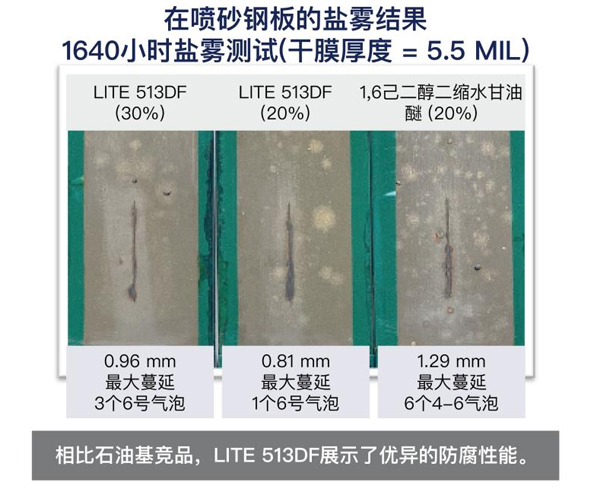 lite 513df是一款基于腰果殼油的新型高生物含量稀釋劑,它的環(huán)氧當(dāng)量比標(biāo)準(zhǔn)的513型號(hào)要低。這款產(chǎn)品適用于環(huán)氧涂料、單組分和雙組分粘合劑以及復(fù)合材料。lite 513df粘度低,具有優(yōu)異的稀釋能力,與雙酚a型液體環(huán)氧樹脂的添加重量曲線如圖所示。作為稀釋劑,它在環(huán)境溫度和低溫下具有良好的硬度發(fā)展。與其他腰果殼油改性的材料類似,lite 513df具有良好的耐水性和柔韌性。在涂料應(yīng)用中,lite 513df在長(zhǎng)期鹽霧試驗(yàn)中表現(xiàn)出非常好的防腐性能,請(qǐng)見(jiàn)本頁(yè)面板的圖片。在粘合劑應(yīng)用中,這種環(huán)氧稀釋劑還可作為改性劑,提高伸長(zhǎng)率和粘結(jié)強(qiáng)度,同時(shí)將對(duì)tg和抗拉強(qiáng)度的影響降至低。